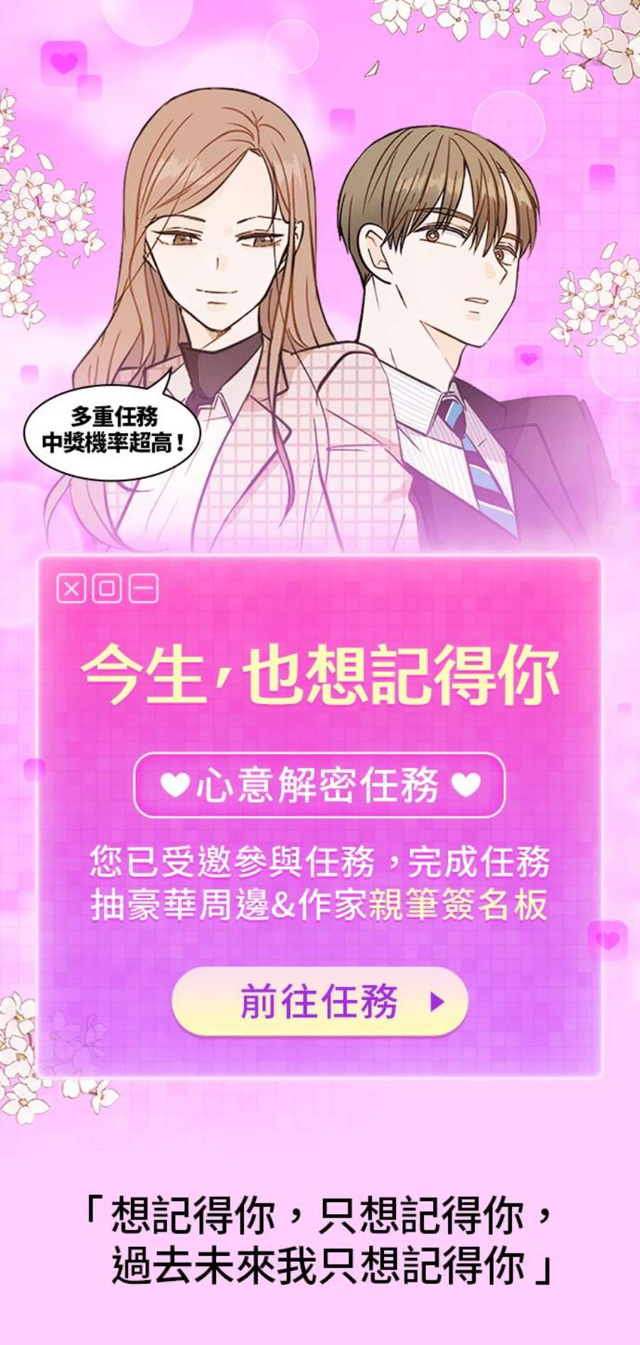 简介转世第18次的她,第一次出现想记下来的人,却因为命运已定不得不离开…今世的她不仅家庭背景改变,容貌也截然不同…到底能不能成功找回那个他呢?